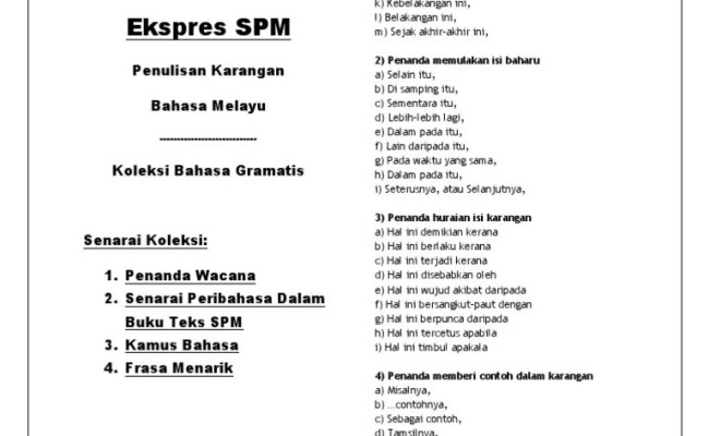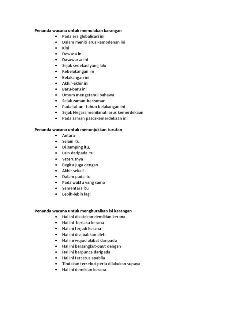 Suddenly, all at once, instantly, immediately, quickly, directly, soon, as soon as, just then, when, sometimes, some of the time, in the meantime, occasionally,. Amir asyraf on twitter nah discourse … Laras bahasa yang digunakan dalam penulisan hendaklah bersesuaian dengan jenis karangan yang dipilih. Sejak sedekad yang lalu, 8. Koleksi soalan peperiksaan, percubaan, ujian, kbat, nota, latihan, modul, jawapan. Yang demikian itu adalah perbuatan fasik. 20.04.2011 · penanda wacana i) penanda permulaan karangan a) pada era globalisasi ini, b) pada zaman pascakemerdekaan ini, c) dalam meniti arus kemodenan ini, d) dewasa ini, e) pada masa ini, f) kini, g) dasawarsa ini, h) dalam meniti kehidupan pada marcapada, i) sejak sedekad yang lalu, j) sejak negara menikmati arus kemerdekaan, k) kebelakangan ini, l) belakangan … Kalimantan timur (disingkat kaltim) adalah sebuah provinsi indonesia di pulau kalimantan bagian ujung timur yang berbatasan dengan malaysia, kalimantan utara, kalimantan tengah, kalimantan selatan, kalimantan barat, dan sulawesi.luas total kaltim adalah 127.346,92 km² dan populasi sebesar 3.793.152 jiwa (). Penanda wacana digunakan untuk menulis ringkasan dan pemahaman, karangan. 07.01.2016 · penanda wacana bahasa inggeris dalam essay.